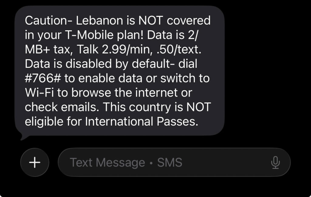 As far as staying connected without WiFi, when I landed in Beirut airport, I received this text from T-Mobile: