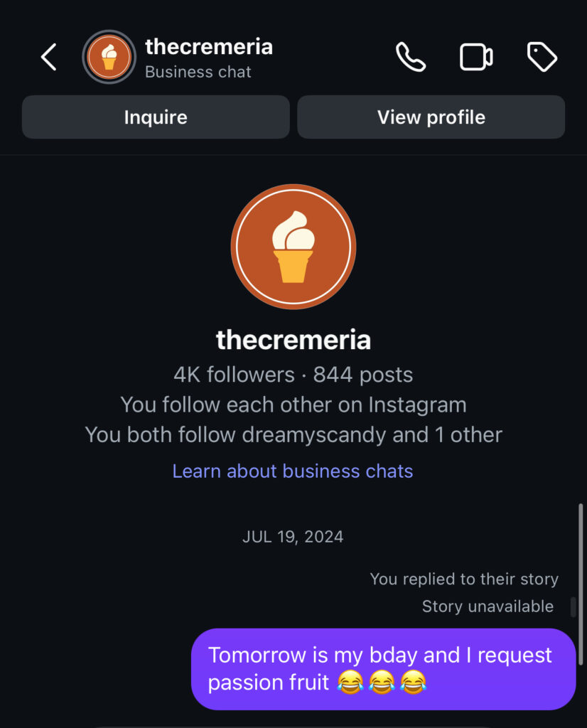 Last year, I was burnt out from travel (some things don’t change!) and decided to spend my birthday upstate at my parents’ house so I could go swimming with my adorable niece. She’s also a cancer and loves to swim as much as I do, and I envisioned flipping our fins in a pool all day was the happiest way I could celebrate (with Prosecco, of course, as the true childfree auntie does). There’s a gelateria upstate, The Cremeria, and they make this passion fruit sorbetto that I would happily drown in. They rotate their flavors everyday, but I decided to DM them on July 19 and say, “Hey you should make passion fruit tomorrow for my birthday.” You can imagine my surprise when I woke up on July 20, they posted their flavors on their IG (as they do everyday) and passion fruit was there.