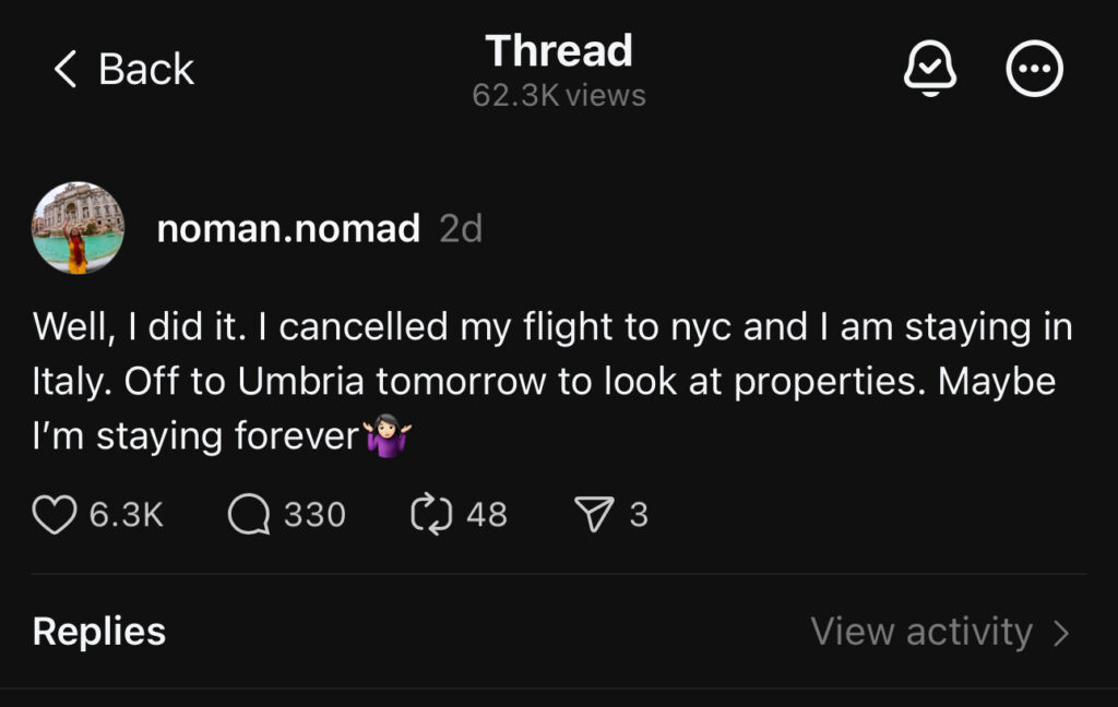 After Idaho, I flew to my happy place: Italy. Like always, I cancelled my flight and decided to stay a while. Feeling like a basket case, I took a long walk from my friend Max’s villa in Florence to Mercato Centrale. While there, I went on Threads and wrote: